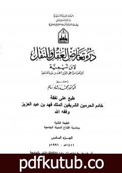 تحميل كتاب درء تعارض العقل والنقل – الجزء السادس pdf الكاتب ابن تيميةدرء تعارض العقل والنقل أو بيان موافقة صريح المعقول لصحيح المنقول أو الجمع بين العقل والنقل هو أحد كتب ابن تيمية وقد ألفه لمناقشة الفلاسفة وأهل الكلام والرد على القانون الكلي لفخر الدين الرازي وماتوصل إليه الرازي من تقديم العقل على النقل في حال تعارضهما.هذه الطبعة طبعت على نفقة الملك فهد بن عبد العزيز رحمه الله بمناسبة افتتحا المدينة الجامعية بجامعة الإمام محمد بن سعود. ولهذا الكتاب أكثر من اسم منها :بيان موافقة صريح المعقول لصحيح المنقولبيان موافقة العقل الصريح للنقل الصحيحالجمع بين العقل والنقلالجمع بين المعقول والمنقولرد تعارض العقل والنقلوغير ذلك ..يُعَدّ هذا الكتاب من أعظم الكتب التي ألّفها شيخ الإسلام ابن تيمية؛ حيث قال عنه ابن القيم: (وإنه كتاب لم يَطْرُقِ العالَمَ له نظيرٌ في بابه).وقال عنه ابن عبد الهادي في ((العُقود الدّرِّيّة)): (وهو كتاب حافلٌ عظيمُ المِقدار، رَدّ الشيخُ فيه على الفلاسفة والمتكلمين).فهو كتاب يبحث في علم الكلام والعقائد وتوحيد الله سبحانه وتعالى، ويرد بقوة على القائلين بوجود تعارض في النصوص مع العقل، الأمر الذي قَرّره بعض المتكلمين والفلاسفة.فيقوم المُؤلِّف بإيراد الأدلة السمعية، ثم يبرهن على إفادتها القطع واليقين، ومن أهم المواضيع التي طرحها في كتابه هذا مسألة العلو والجهة، والمَعاد، والتنزيه عن الشركاء، وحدوث العالم، والاستواء، وغيرها من المواضيع العَقَدية المُهِمّة جداً.والمُؤلِّف هو شيخ الإسلام أبو العباس تقي الدين أحمد بن عبد الحليم بن عبد السلام ابن تيمية الحراني الدمشقي الحنبلي (661-728ﻫ)، ولد في حران، وتحول به أبوه إلى دمشق فنبغ واشتهر، سُجِنَ وأُطلِقَ أكثرَ من مرّة، ومات معتقلاً بقلعة دمشق، فخرجت دمشق كلها في جنازته، كان كثير البحث في فنون الحكمة، آيةً في التفسير والأصول، داعيةَ إصلاح في الدِّين، فصيحَ اللسان، قلمُه ولسانُه متقاربانأما تصانيفه فربما تزيد على أربعة آلاف كراسة، وقيل أنها تبلغ ثلاث مئة مجلد، منها: (السياسة الشرعية)، و(الفتاوى)، و(منهاج السنة)، و(رفع الملام عن الأئمة الأعلام)، و(التوسل والوسيلة)، و(نقض المنطق)، و(السياسة الشرعية في إصلاح الراعي والرعية)، وغيرها الكثير.بيانات الطبعة الأصلية: طبع هذا الكتاب عن الطبعة الأصلية المعتمدة، والمطبوعة في المطبعة الكبرى الأميرية ببولاق مصر المحمية سنة 1321ﻫ.كتاب يبحث في علم الكلام والعقائد وتوحيد الله سبحانه وتعالى، وموضوع هذا الكتاب كما يدل عنوانه هو دفع التعارض الذي أقامه المتكلمون والفلاسفة بين العقل والنقل أي الكتاب والسنة، فيقرر ابن تيمية الأدلة السمعية ويبرهن على إفادتها القطع واليقين فيقول : ” أما كتابنا هذا فهو في بيان انتفاء المعارض العقلي وإبطال قول من زعم تقديم الأدلة العقلية مطلقا” . ومن أهم المواضيع التي طرحها في كتابه هذا مسألة العلو والجهة، والمعاد، والتنزيه عن الشركاء، وحدوث العالم، والاستواء وغيرها من المواضيع العقدية الحساسة جدا وهذه طبعة مضبوطة ومخرجة الآيات والأحاديث مع ترجمات لبعض الأعلام.درء تعارض العقل والنقل – الجزء السادس pdfهذه الطبعة طبعت على نفقة الملك فهد بن عبد العزيز رحمه الله بمناسبة افتتحا المدينة الجامعية بجامعة الإمام محمد بن سعود.هذا الكتاب من تأليف ابن تيمية و حقوق الكتاب محفوظة لصاحبها